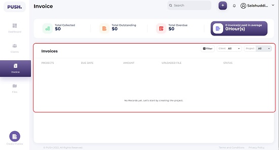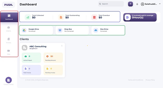 The PUSH. Invoicing Interface is very simple and easy to navigate. The vertically placed Side Panel provides an easy link to the Main Dashboard. It also houses the links to Manage your Clients, Invoices and Digital Goods (Files).