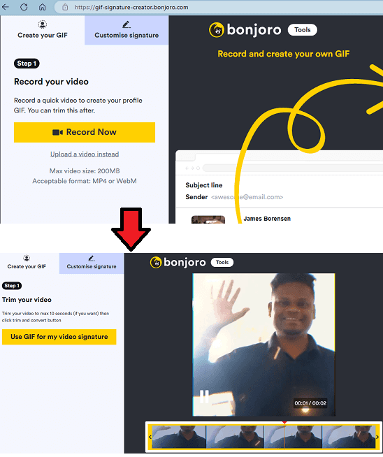 With Bonjoro, you can generate emails signatures for personal as well as professional use. You can use it unlimited number of times and on the main website there, you don’t even have to sign up or register. There is a 3-step process to generate your animated signature and that’s all.