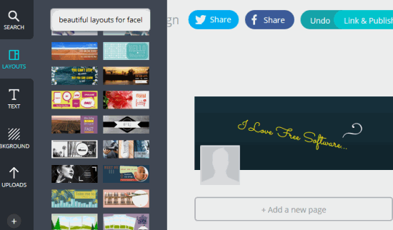 In above screenshot, you could see layouts available in Canva at left side. At right side, you can create design, like I have created a simple Facebook cover.