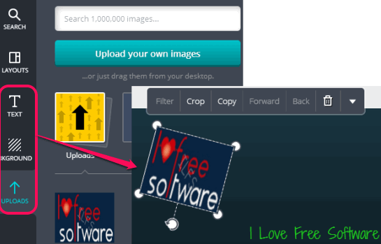 After choosing the background, use UPLOADS section to add image from PC. Jpg, png, and svg images are supported. Image can be resized and can also be rotated.
