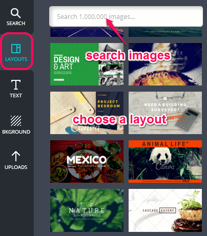 After selecting the option, you will come to the LAYOUTS option. Plenty of layouts will be visible to you. However, some of those layouts come with Canva watermark. So find out watermark free layouts and choose the required one. You can also search other layouts by entering the keywords in search box.