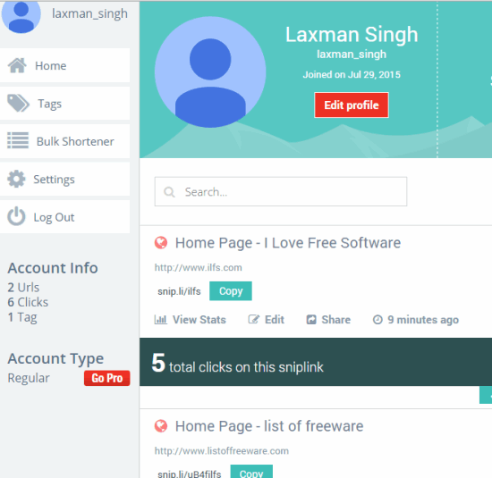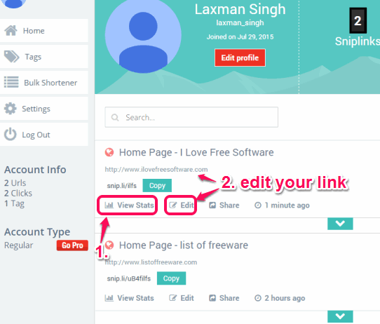Whenever you need to edit the short links or check the stats, you can open the dashboard of your account. After this, you can use the suitable option(s). Edit, View Stats, and few other options are available which you can access.