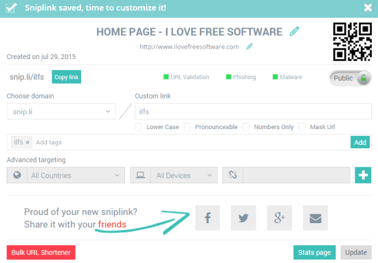 Other than this, Advanced targeting options are also available but you can’t use them in the free plan. When your URL is generated, you can share it with your friends and also paste on your Twitter, Google+, and Facebook accounts.