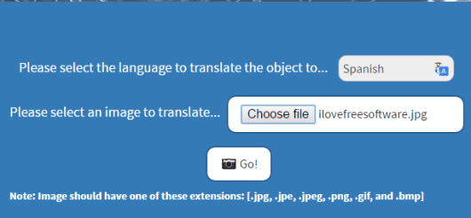 Objectify! is a free and very interesting service to identify object in images and translate them to any language. This can be handy especially when you want to know the name of the object in some foreign language. Just upload the image, select the language, and it will then show the name of the object available in the image. The name is shown in both English and the language (French, Russian, Spanish, Arabic, etc.) selected by you. To identify object in images, the service uses Google Cloud Vision API to show the name of the object available in an image.