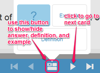 By default, answer part of each particular card will remain hidden. But it is completely your wish which part you want to hide and display. Using Hide/Show button, you can hide a definition, an example, or the answer.