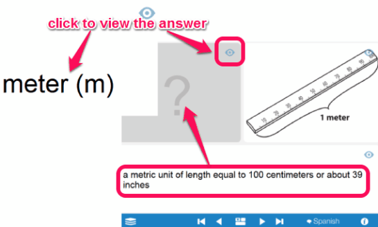 Math Vocabulary Cards is an online application that helps to learn Math terms in an entertaining way. It simply provides a set of cards and each card contains a definition and an example (or diagram) for a Math term. With the help of that definition and example, you need to think the correct answer for that particular term. For example, a two-dimensional (flat) shape with 6 sides is said to be a hexagon. Here, hexagon is a key term of Mathematics, and rest of the part is definition for that term. To reveal the right-answer, you can use view (or eye) icon.