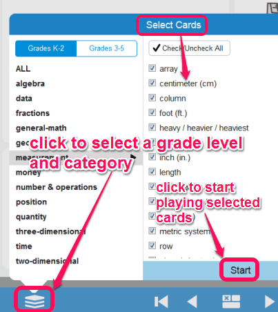 Use Stack like icon to select a grade level and category of cards. Available categories are: algebra, geometry, quantity, three-dimensional, two-dimensional, time, fractions, general-math, data, fractions, position, money, and number & operations.