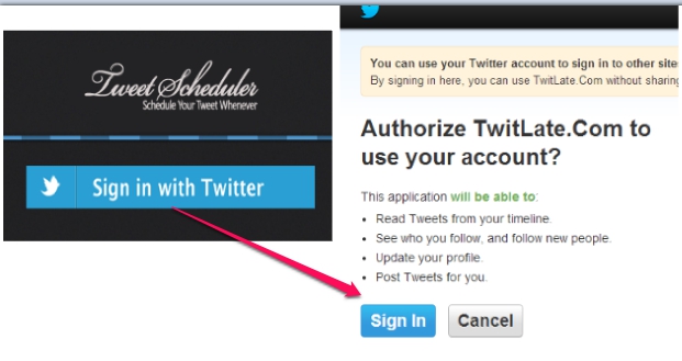 Open the homepage of TwitLate.com to schedule tweets for future or for today. Its homepage link is available at the end. On its interface, you first have to sign in to your Twitter account to allow TwitLate.com to access your Twitter account.