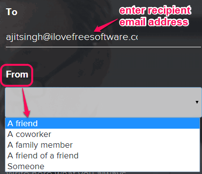 Step 1: At right side on its homepage, you can enter recipient’s email address at required area. At a time, you can send one message to one person. But there is no limit to send messages.