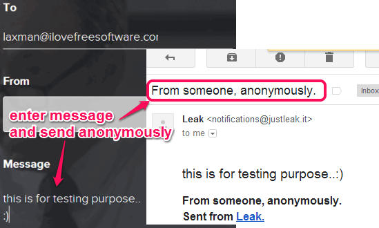 After typing the message, click on SEND THIS LEAK ANONYMOUSLY button. Message delivery is also instant, so this makes it more useful. Recipient will get the email with your message but sender information will not be available.