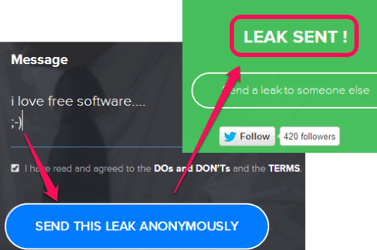 Note: Although there would be no record about you, but a link is maintained between Leak and your IP address on servers. This is for security purpose, just in case. So, you should be careful and not send inappropriate or abusive content.