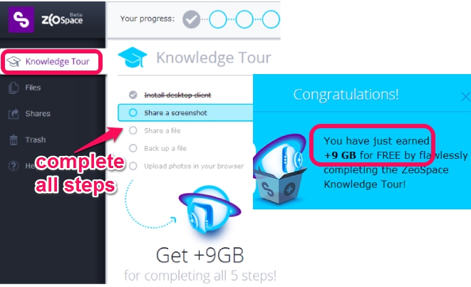 If you want to extend this 1 GB free space upto 10 GB, then you need to complete a knowledge tour, that contains five different steps: install ZeoSpace application on PC, capture and share a screenshot, share a file using desktop app, backup a file online, and upload & view photo online on your ZeoSpace account.