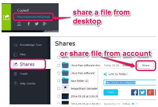 Sharing files online with ZeoSpace and keeping a backup of files with its PC client are two different tasks, but related to each other. Files can be shared without any sign-up process, as well as by creating an account, and using a desktop application. Desktop application is used to backup important data and share files. Let’s have a look at both features: