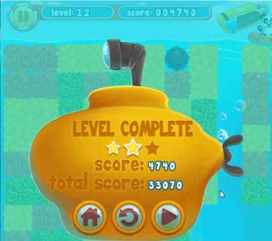 When the pandas are rescued they sit in a boat and row away as can be seen in the screenshot above. The level completion screen can be seen below, where you score is mentioned and you can move on to the next level.