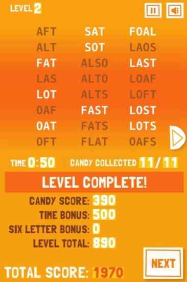 As soon as you find 11 words, the level up screen will come up, as shown in the screenshot above. On level up all the candies will go away and the words hidden behind them will be revealed. Your score will be shown at the bottom of the window. The next button will take you to the next level. In case you are not able to complete the level, you will be asked to retake the level with different set of letters.
