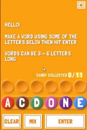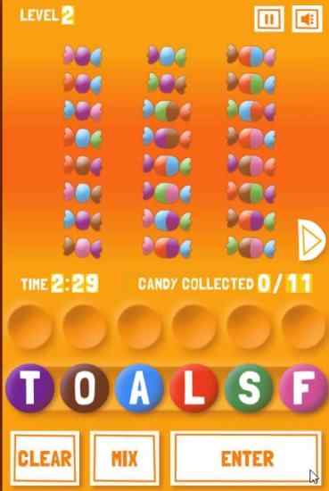 Below the candies on the left side is your game timer. You have to find 11 words in that amount of time or its game over for you if the timer runs out. The bottom of the window has three buttons. When you have entered a word click the enter button and if its right it will show up at the top. The mix button will jumble up the letters given, to help you out. The clear button will clear any wrong word you entered.