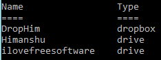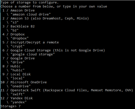 - Type: Choose domain of your cloud storage account. To select a particular drive account you need to press the number written corresponding to that storage type and hit the Enter button. I configured my Google Drive account with it, so I pressed “7” key and then hit the Enter button.
