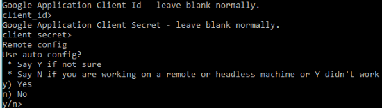 - Client_id & Client_Secret: It will then ask you to specify Google Client_id which you can leave blank and hit Enter to continue. It will then prompt you to enter Google Client_secret which you can again leave blank and press Enter to continue.