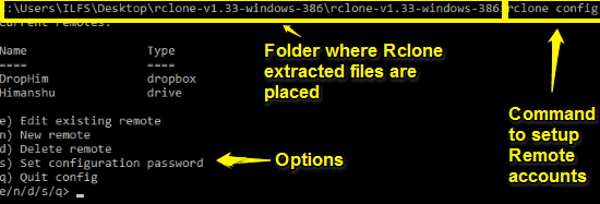Step 2: Before you can use this free command line tool to backup files between local storage to Dropbox, Google Drive, etc, you will have to first setup your cloud storage account. Configuring remote storages account is quite simple using this free command line tool. You just have to execute a simple command i.e. “rclone config” and it will then guide you through options to add/remove a cloud storage account.