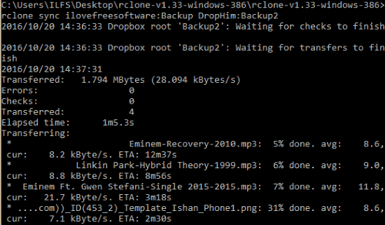 Rclone is a free open source command line tool to backup files from local storage to Dropbox, Google Drive, Amazon drive, etc. The best part of this command line tool is that it provides a one-way sync between two different cloud storage platforms. You can use it to directly sync 2 cloud folders on different cloud platforms. It provides 3 modes to sync files to and from these different cloud storage mediums. You can use its copy mode to transfer only new or changed files, sync mode to make directories identical and check mode to verify the integrity of files using MD5/SHA1 hashes. It is available for Windows, Linux, Mac, Solaris, OpenBSD, etc.