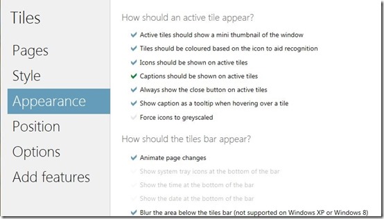 This software to arrange icons looks to be a very attractive one at first sight. The icons that you drop in the sidebar are attached as tiles. These tiles contain a mini- thumbnail of the window and its icon. These are only visible in the active applications tiles ( see in the above screenshot). The software allows you to switch on/ off these thumbnails and icons in the tiles.
