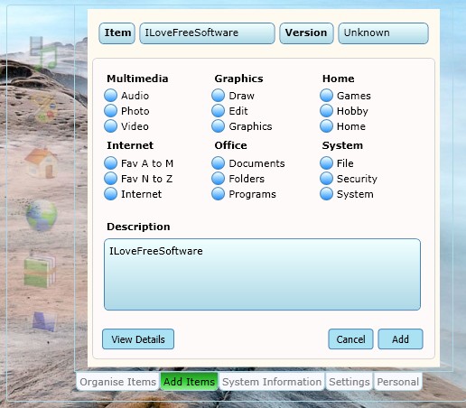 Various different options for file management can be accessed from the bottom right corner tabs. Clicking on Add Items tab first opens up a drag and drop field, where you need to drop the files and application shortcuts that you’d like to add to Concord. After dragging and dropping a file, you’ll be able to select which category it’s gonna be added, type in a name, and a description. Click Add to finish up.