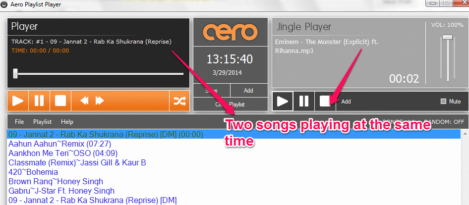 Step 3: Hit the play button of the main player to start playing the song of the playlist. Hit the play button of the “Jingle” player and the song added on it will start playing. Thus you can play the two songs simply in one time.