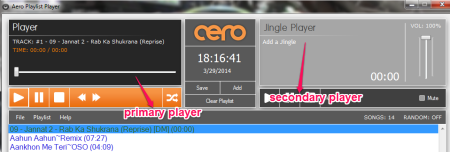 Aero Playlist player is a simple mp3 player that can play audio files, but no video files. You can always save the playlist of the current songs that you are playing, and then reload it whenever you want. The software has two players to play two songs at one time, one on the main player and another on the secondary player called “Jingle Player”.