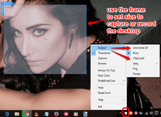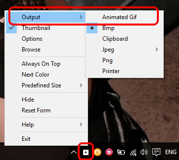 That’s it! Now execute the software and it will run in the system tray. It doesn’t come with any UI. You need to double-click its tray icon to open the frame to set the size for output file(s). After this, right-click the system tray → access Output option → and you will find Animated Gif option. Now the output size is set, double-click on the frame to start the recording.