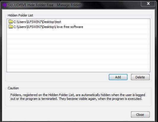 The Manage Folder option leads you to the main interface where you have to add files that you wish to hide. The selected files are then hidden automatically as soon as you logout. The files hidden, automatically show up on your system as soon as you log in the next time. There is also an option to delete files from the list if you wish to unhide them.