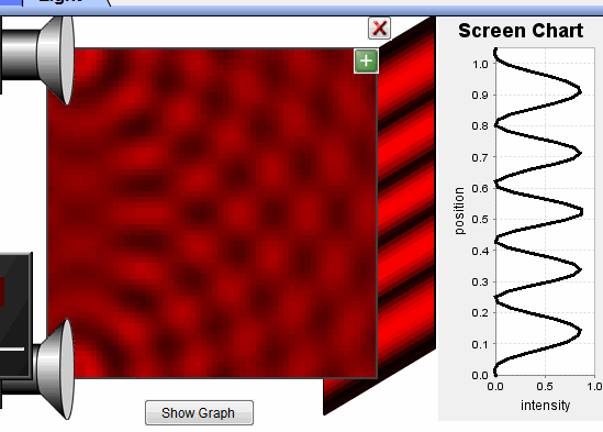 Why I like Wave Interference software is because you can very easily vary the parameters of the wave which are the frequency and the amplitude of the travelling wave. The simulation is carried in real time and you can see the wave pattern (which is differentiated by light) as you change the wave properties.