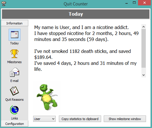 These software can motivate you to get rid of those death sticks that are dangerous to your health as well as eating your money. Most of these software provide motivational quotes and messages that will be helpful to prepare your body and mind to quit smoking. These software also come with their unique features. For example, you can check how many days of life have been saved after quitting smoking, keep stats, enter custom messages to display on screen, etc. Let’s start with the first software in this list.