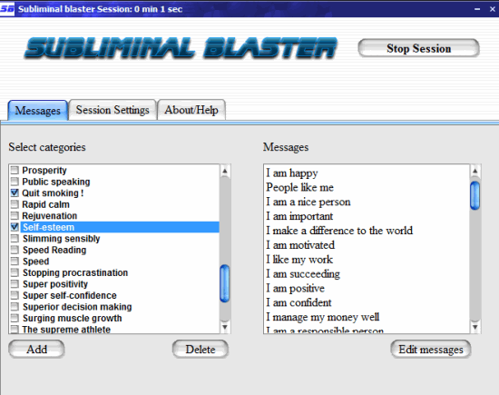 Subliminal blaster provides plenty number of categories and every single category comes with a lot of messages. Among those categories, you will also find Quit smoking! category that provides multiple motivational messages to help quit smoking. You can also edit any message and start the session. Moreover, a new custom category can also be added by you easily.