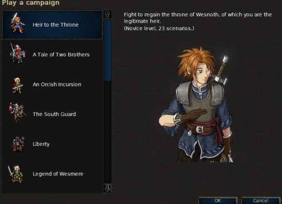 - Heir to the Throne: Fight to regain the throne of Wesnoth. This is a novice level game with 23 scenarios.