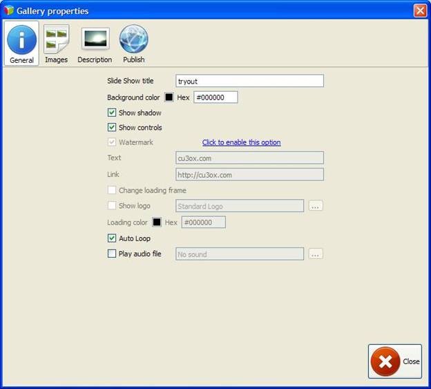 From general tab, you can provide the title of your gallery and provide audio file to add music to the slideshow. Since I am using the free version of the software the Watermark cannot be changed but it is possible in paid version.