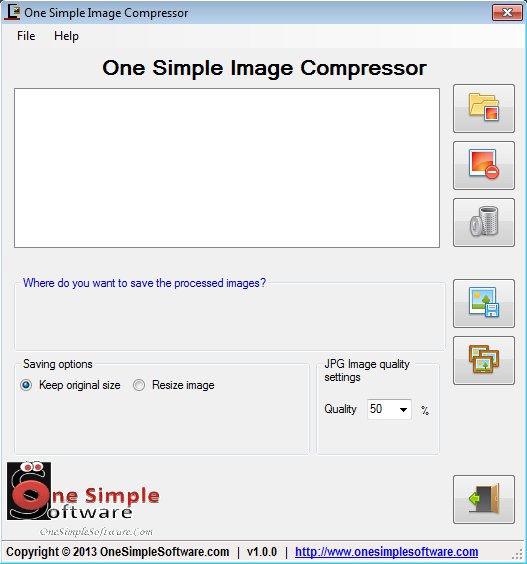 Large empty field which can be seen on the image below is reserved for the list of images and photos that you’d like to compress. Right sidebar has pretty much the same options that you’ll find by clicking on File in the top left corner, for adding images, removing existing ones from the list and lastly for starting image compression.