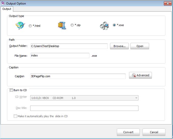 Select the type of flip book that you want to create, choose an output directory or if you want it burned to a CD right away put a check mark on that option down below. Click on Convert and your flipbook should be created.