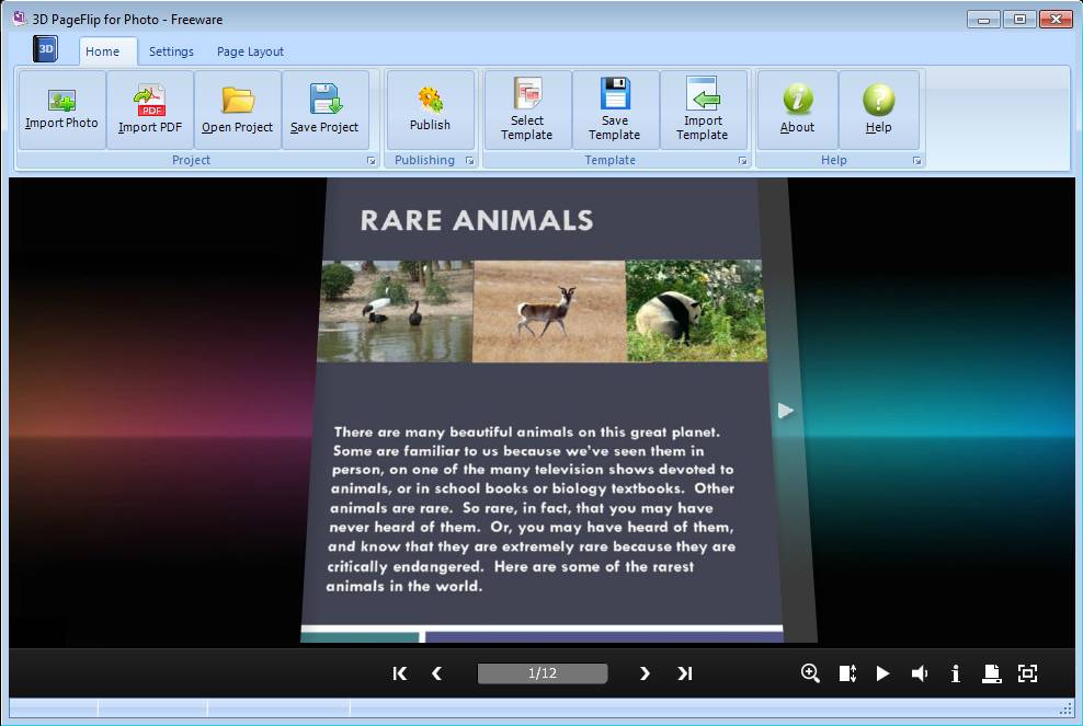 Interface of this free 3D flip book creator is very similar to that of Office. At the top of the window we have tabs that you can use to switch through sub-menus. The first one, Home can be seen in the image above. This is where you can open and import the photos and PDF documents that you want to use. The next one Settings is where you can change flipbook options, and the last one would be where the layout can be changed. Rest of the window is reserved for the flip book preview where you can see how your flipbook is gonna look like.