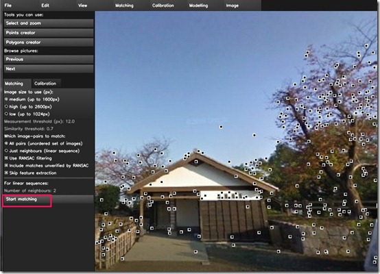 Once the pictures are uploaded, click on the start matching button given in the left panel. The software automatically detects all the parameters of the camera used in capturing those pictures and marks all the important points in all the pictures. All the similar points in all pictures are marked by small squares. If the pictures match the criteria, a lot of squares can be seen on the screen.