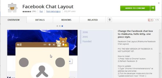 Facebook Chat Layout is a free Google Chrome extension that changes the look of your Facebook chat window. It’s a nice free extension that turns the plain Facebook chat window into a cutely animated window, by applying funky skins to it. Facebook Chat Layout offers three different skins for your chat window: Rilakkuma, Hello Kitty, One Piece. Each of these skins reflects a popular cartoon character from Japanese fiction world, which are usually found printed on a variety of products like t-shirts, games, lunch box, water-bottles, accessories, etc.