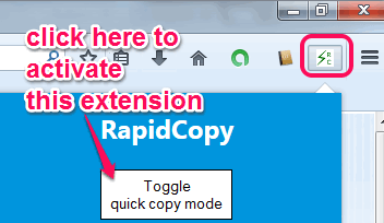 After installing this add-on, you will find its icon at top right corner of your browser. Click that icon and use Toggle quick copy mode. This will activate this extension.