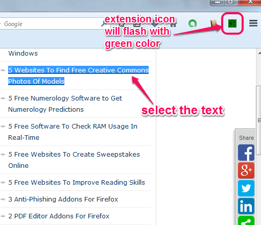 Now you can select any text content and it will be copied to Clipboard automatically. Its extension icon will also flash with green color. This will let you know that extension is working and text is copied successfully.