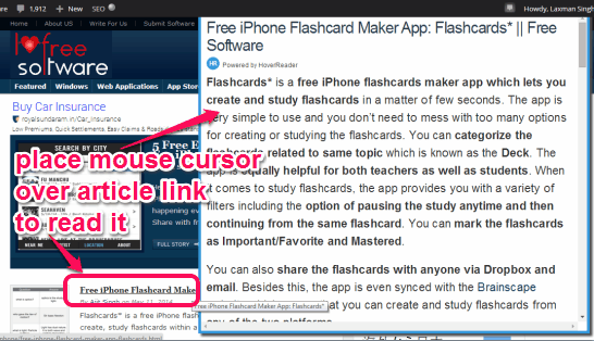 HoverReader is a Chrome extension that helps to read links within the same tab without clicking on link. As soon as you place mouse cursor over a link, it opens a pop up window (or you can say a preview window) to read that webpage. So, instead of opening another page to read contents of that, you can read the contents while staying in same webpage.