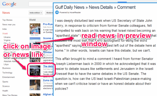 Now you can read any article or news within the same tab by just hovering the mouse cursor over a news link. For this, just go to any news aggregator’s webpage, say Google News, and place mouse cursor over a link. It will immediately pop up a window, just like you could see in screenshot below. Not only news link, it will even work if you place mouse cursor on image thumbnail of that particular news. You can now read full news or article without any need to go through the link in a new tab.