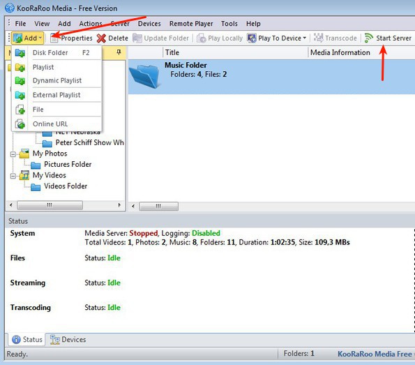 When you first run KooRaRoo, DLNA server will be up and running automatically. While it’s running you cannot add new media to the default one found in the three aforementioned home folders, My Music, My Videos and My Photos.