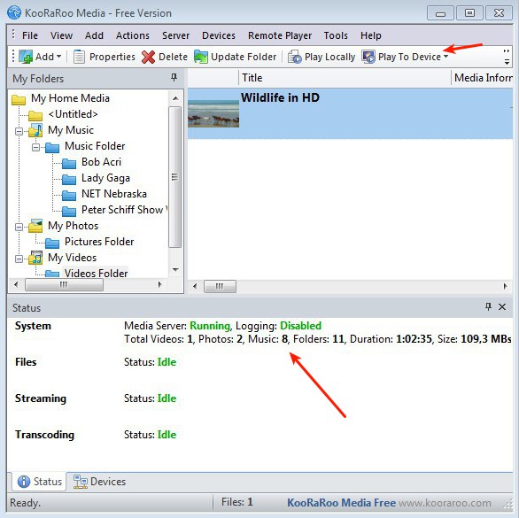 Status window down below should turn to running and your free DLNA server should work. Try connecting to it with your media player or play media directly using the Play To Devices option from the toolbar at the top.
