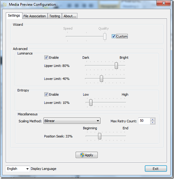 The media configuration wizard opens the associations tab. The tab allows you to choose file formats you want associated with Media Preview. You can save yourself the trouble of selecting all file formats individually and use the Select All button to select all of them at once or uncheck them all at once by clicking Select None. File formats checked will be previewed with the help of Media Preview. You can also add your own file formats by entering the extension in the User Defined Formats textbox and click Add. Get rid of user defined formats by clicking Remove. Click Apply to save configuration settings.