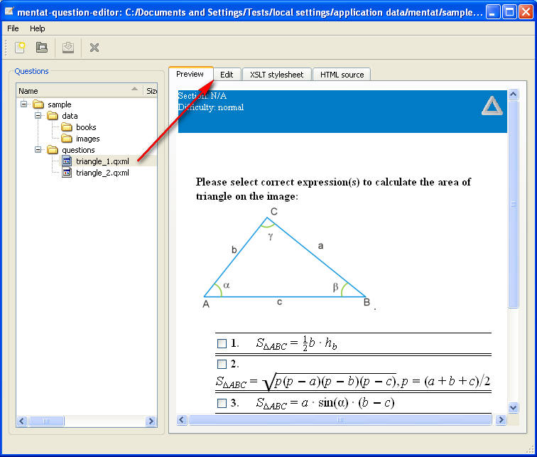 Here we see an example question opened in the Preview tab, to edit it you need to open up the Edit tab. To create questions some basic knowledge of XML is needed, but everything is made easier by the fact that there are examples which you can open and easily learn from.