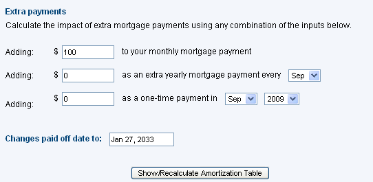 Using one more more of the above options, you can get your amortization schedule recalculated and see how it changes. This option is really good, and it is sometimes enlightening to see how even a small additional monthly payment can greatly reduce your payoff date.