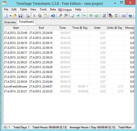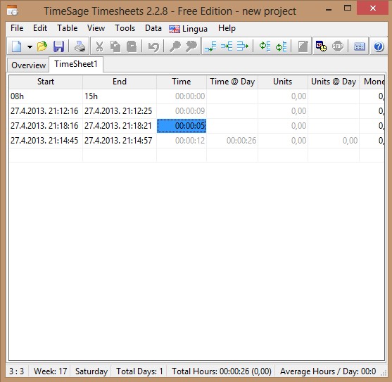 To manually add values to the time sheet, select Table >> Add row. They can be added either above or below existing ones on the list. Order in which they’re show can also be changed. Click on a certain value from the list, on a certain column, allows you to edit it.